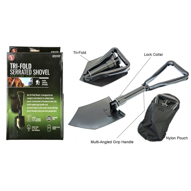 Our Tri-Fold Shovel is designed to be compact and stored in its oxford nylon pouch. Constructed of hardened steel, the multi-angles grip handle and serrated-edges on the spade-head will help pierce through roots and hard-packed dirt.